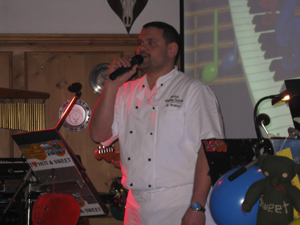 Am Samstagabend gegen 18:30 Uhr wurden wir von Familie Duffner und dem restlichen Team vom Hotel „Schöne Aussicht“ mit einem leckeren, selbstgemachten Likör und Sekt zu dem eigentlichen Sportfahrertreffen begrüßt. Nach dem Aperitif ging es auch schon in den schön dekorierten Saal zum gemütlichen Abendessen. Bei Bestellung „à la Carte“ konnte man sich nochmal so richtig kulinarisch verwöhnen lassen, begleitet von zwei lustigen Unterhaltern, die Axel zur abendlichen Animation organisiert hatte. Sie trugen zur lockeren und lustigen Stimmung zwischen den „Gängen“ bei und sorgten mit ihren Darbietungen für etliche Lacher.